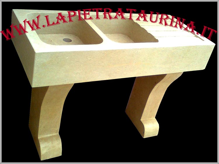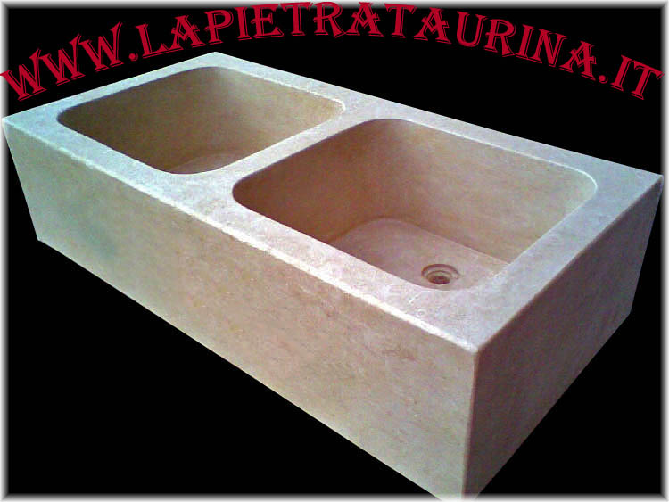 Lavandino in massello a due vasche con gocciolatoio a destra e piedi da appoggio.